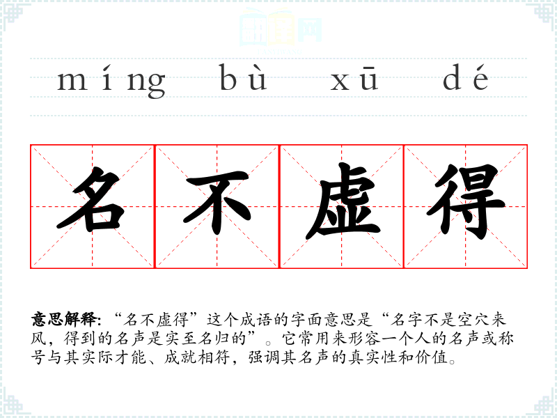 “名不虚得”这个成语的字面意思是“名字不是空穴来风,得到的名声是实至名归的”。它常用来形容一个人的名声或称号与其实际才能、成就相符,强调其名声的真实性和价值。