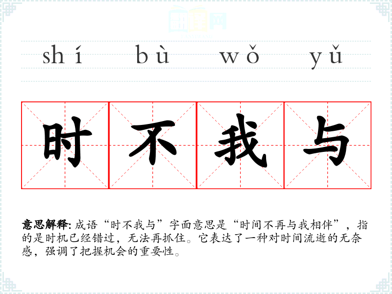 成语“时不我与”字面意思是“时间不再与我相伴”,指的是时机已经错过,无法再抓住。它表达了一种对时间流逝的无奈感,强调了把握机会的重要性。