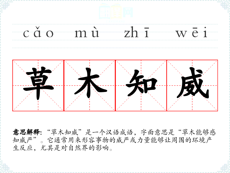 “草木知威”是一个汉语成语,字面意思是“草木能够感知威严”。它通常用来形容事物的威严或力量能够让周围的环境产生反应,尤其是对自然界的影响。