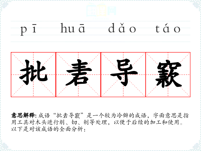 成语“批砉导窾”是一个较为冷僻的成语,字面意思是指用工具对木头进行削、切、刨等处理,以便于后续的加工和使用。以下是对该成语的全面分析: