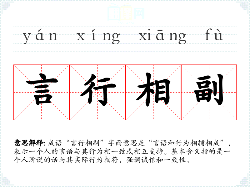 成语“言行相副”字面意思是“言语和行为相辅相成”,表示一个人的言语与其行为相一致或相互支持。基本含义指的是一个人所说的话与其实际行为相符,强调诚信和一致性。