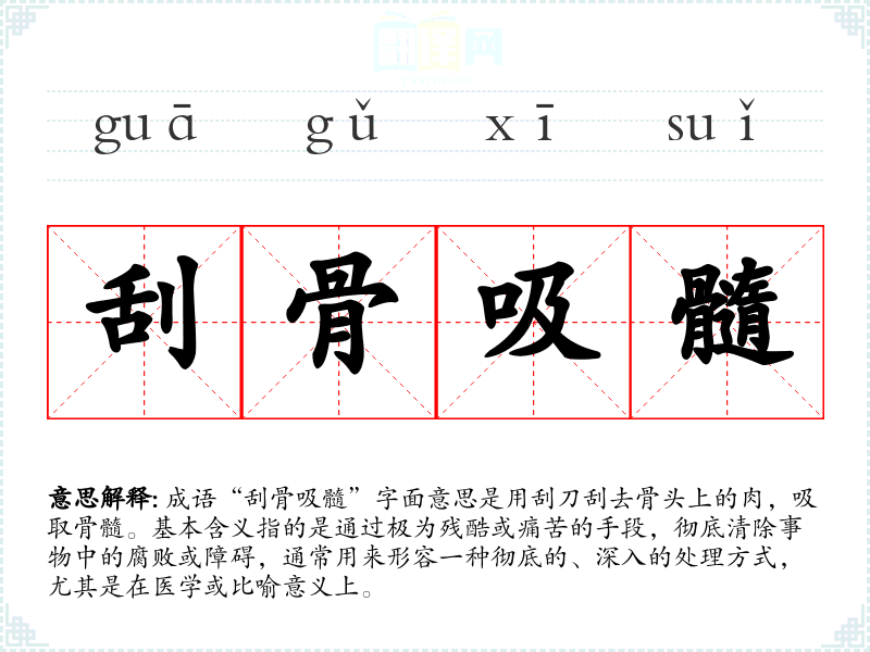 成语“刮骨吸髓”字面意思是用刮刀刮去骨头上的肉,吸取骨髓。基本含义指的是通过极为残酷或痛苦的手段,彻底清除事物中的腐败或障碍,通常用来形容一种彻底的、深入的处理方式,尤其是在医学或比喻意义上。