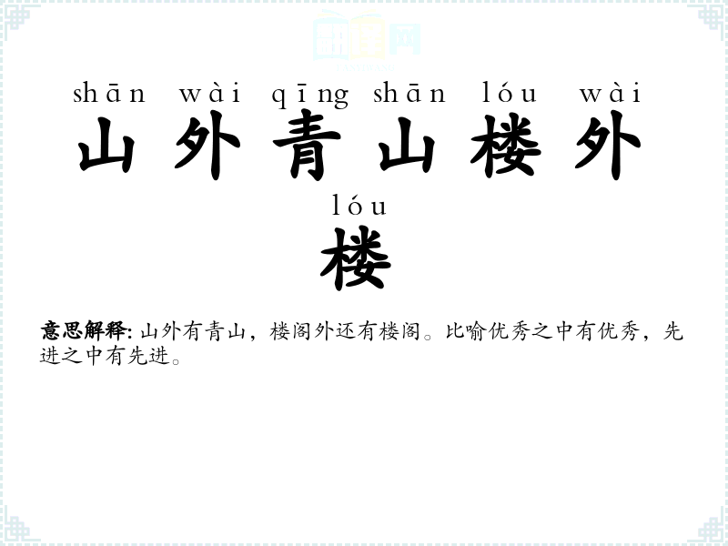 | 山外青山楼外楼 | 山外有青山,楼阁外还有楼阁。比喻优秀之中有优秀,先进之中有先进。 |