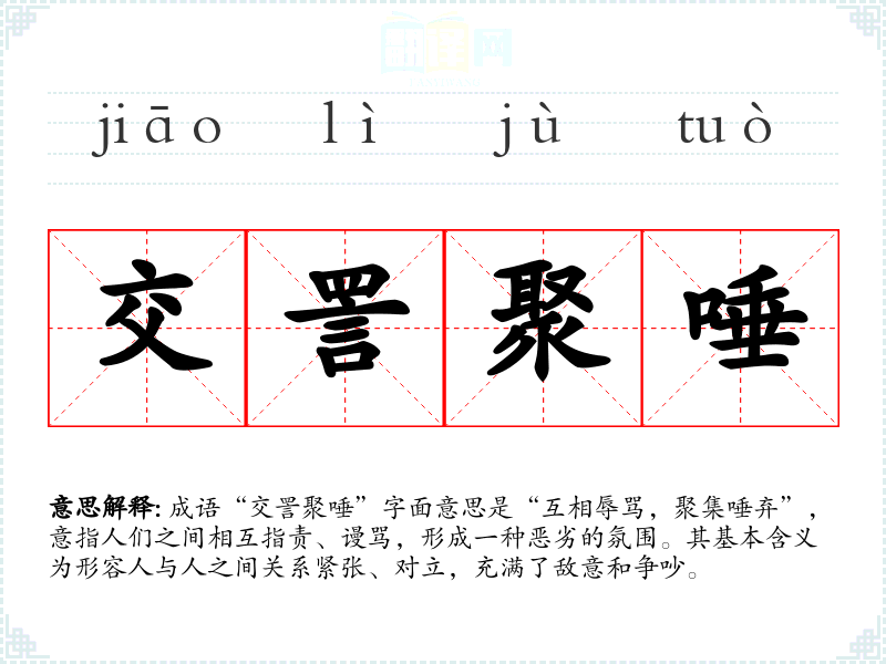 成语“交詈聚唾”字面意思是“互相辱骂,聚集唾弃”,意指人们之间相互指责、谩骂,形成一种恶劣的氛围。其基本含义为形容人与人之间关系紧张、对立,充满了敌意和争吵。