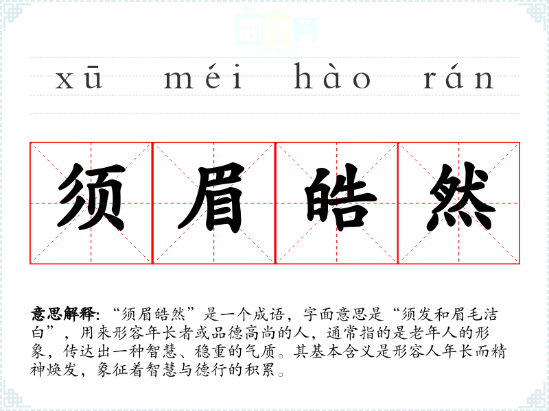 “须眉皓然”是一个成语,字面意思是“须发和眉毛洁白”,用来形容年**或品德高尚的人,通常指的是老年人的形象,传达出一种智慧、稳重的气质。其基本含义是形容人年长而精神焕发,象征着智慧与德行的积累。