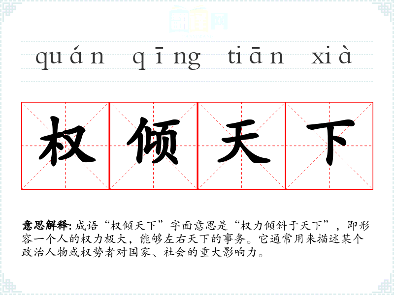 成语“权倾天下”字面意思是“权力倾斜于天下”,即形容一个人的权力极大,能够左右天下的事务。它通常用来描述某个政治人物或权势者对国家、社会的重大影响力。