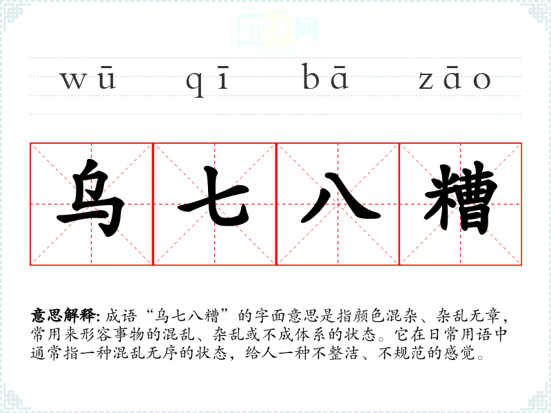 成语“乌七八糟”的字面意思是指颜色混杂、杂乱无章,常用来形容事物的混乱、杂乱或不成体系的状态。它在日常用语中通常指一种混乱无序的状态,给人一种不整洁、不规范的感觉。