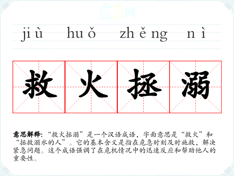 “救火拯溺”是一个汉语成语,字面意思是“救火”和“拯救溺水的人”。它的基本含义是指在危急时刻及时施救,解决紧急问题。这个成语强调了在危机情况中的迅速反应和帮助他人的重要性。