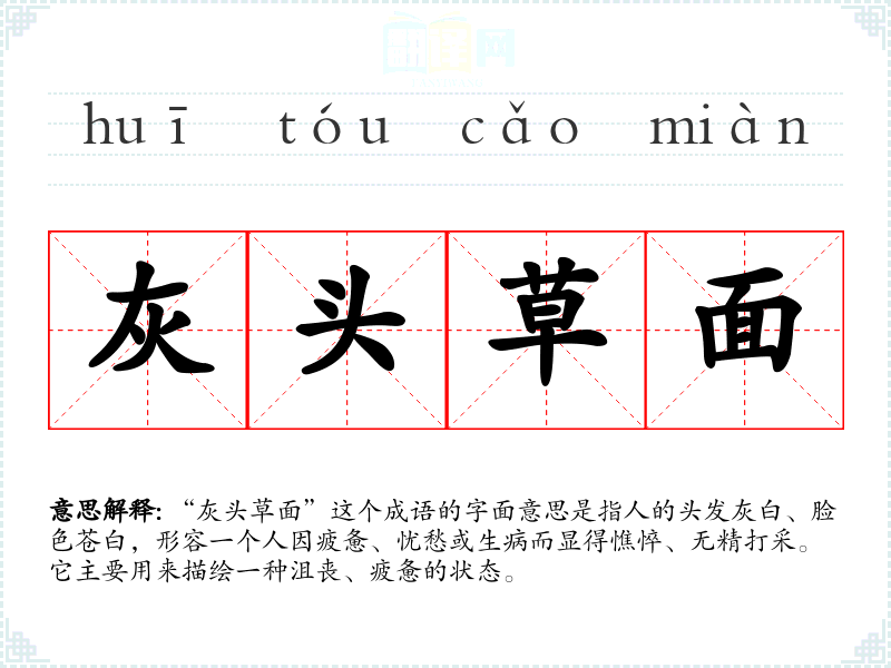 “灰头草面”这个成语的字面意思是指人的头发灰白、脸色苍白,形容一个人因疲惫、忧愁或生病而显得憔悴、无精打采。它主要用来描绘一种沮丧、疲惫的状态。