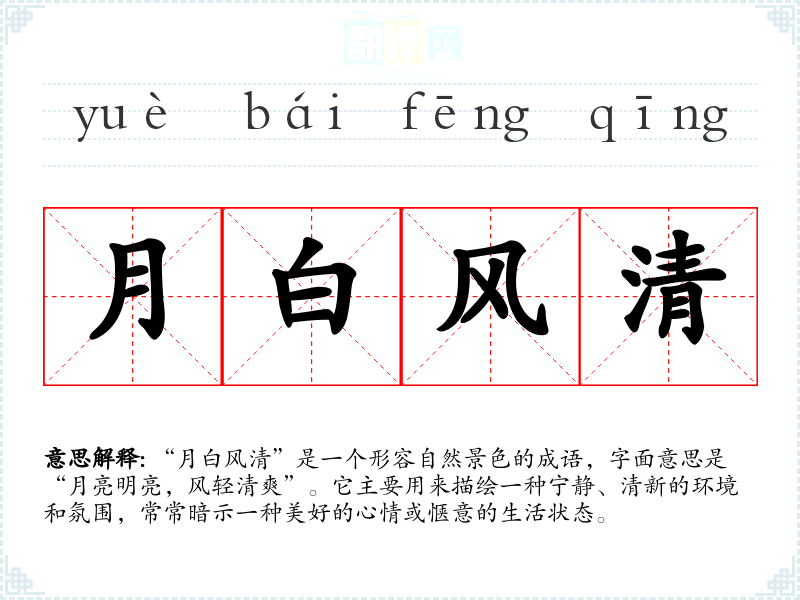 “月白风清”是一个形容自然景色的成语,字面意思是“月亮明亮,风轻清爽”。它主要用来描绘一种宁静、清新的环境和氛围,常常暗示一种美好的心情或惬意的生活状态。