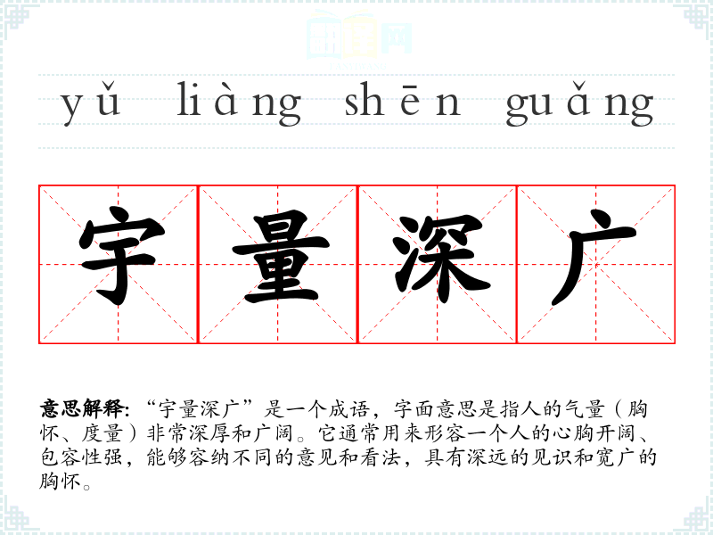 “宇量深广”这个成语的具体来源较为模糊,但可以追溯到古代文献中关于“宇”和“量”的用法。“宇”指的是空间、范围,通常用来形容人的心胸;“量”则指的是度量、容量,常常与人的性格、道德修养相关。这个成语强调的是一个人的精神境界和人格魅力,可能受到儒家文化中“宽容大度”理念的影响。