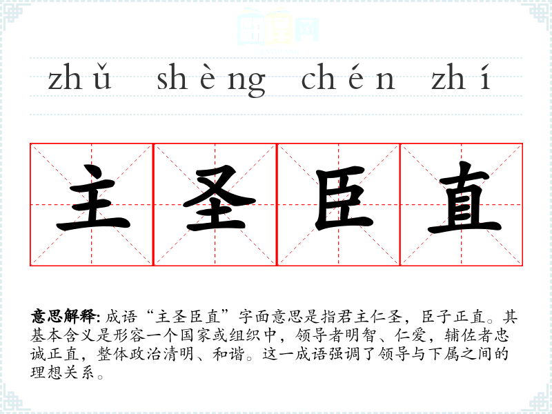 成语“主圣臣直”字面意思是指君主仁圣,臣子正直。其基本含义是形容一个国家或组织中,领导者明智、仁爱,辅佐者忠诚正直,整体政治清明、和谐。这一成语强调了领导与下属之间的理想关系。