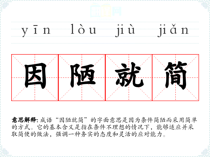 成语“因陋就简”的字面意思是因为条件简陋而采用简单的方式。它的基本含义是指在条件不理想的情况下,能够适应并采取简便的做法,强调一种务实的态度和灵活的应对能力。