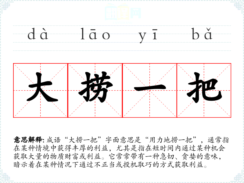 成语“大捞一把”字面意思是“用力地捞一把”,通常指在某种情境中获得丰厚的利益,尤其是指在短时间内通过某种机会获取大量的物质财富或利益。它常常带有一种急切、贪婪的意味,暗示着在某种情况下通过不正当或投机取巧的方式获取利益。