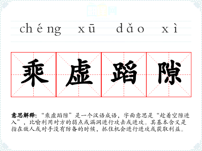 “乘虚蹈隙”是一个汉语成语,字面意思是“趁着空隙进入”,比喻利用对方的弱点或漏洞进行攻击或进攻。其基本含义是指在敌人或对手没有防备的时候,抓住机会进行进攻或获取利益。