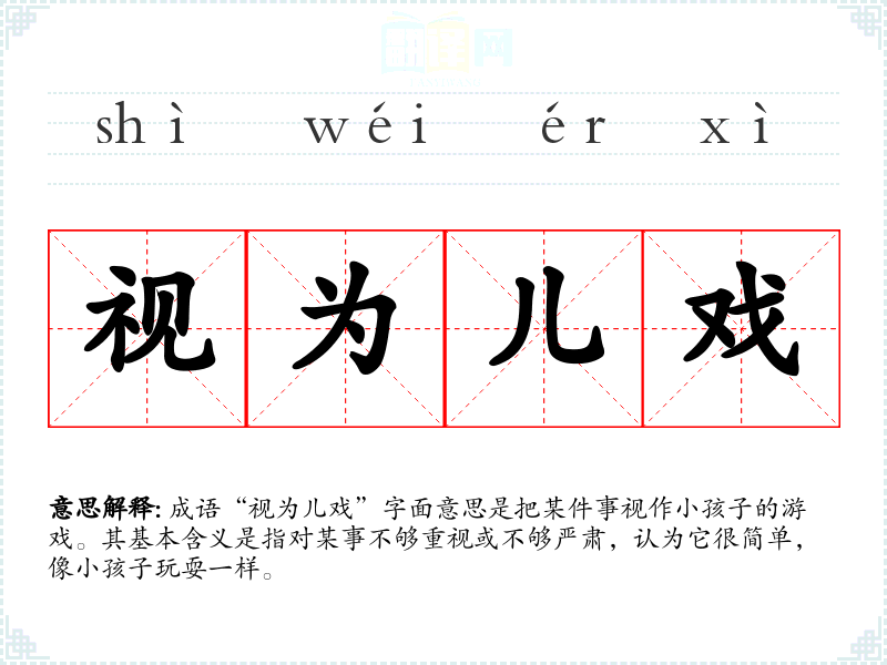 成语“视为儿戏”字面意思是把某件事视作小孩子的游戏。其基本含义是指对某事不够重视或不够严肃,认为它很简单,像小孩子玩耍一样。