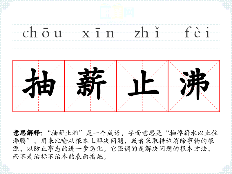 在英语中,可以用“cutting the root”或“addressing the root cause”来对应“抽薪止沸”。这些表达同样强调解决问题时要关注根本原因,与“抽薪止沸”的核心思想是一致的。