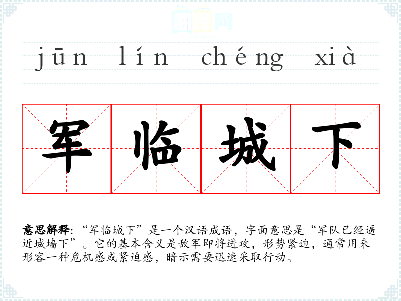 “军临城下”是一个汉语成语,字面意思是“军队已经逼近城墙下”。它的基本含义是敌军即将进攻,形势紧迫,通常用来形容一种危机感或紧迫感,暗示需要迅速采取行动。