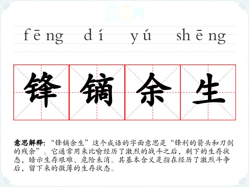 “锋镝余生”这个成语的字面意思是“锋利的箭头和刀剑的残余”。它通常用来比喻经历了激烈的战斗之后,剩下的生存状态,暗示生存艰难、危险未消。其基本含义是指在经历了激烈斗争后,留下来的微*的生存状态。