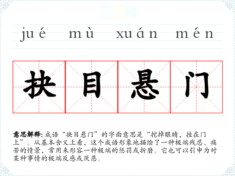 成语“抉目悬门”的字面意思是“挖掉眼睛,挂在门上”。从基本含义上看,这个成语形象地描绘了一种极端残忍、痛苦的情景,常用来形容一种极端的惩罚或折磨。它也可以引申为对某种事情的极端反感或厌恶。