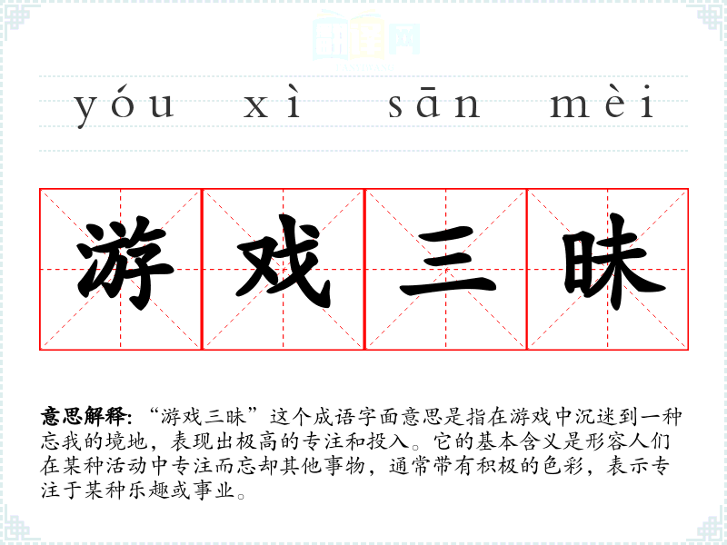 “游戏三昧”源于**的“三昧”一词,原本指一种深度的冥想状态,进入一种超越世俗的境界。在这里,“游戏”表示一种享受和体验的状态,结合成语的整体意思,体现了一种在游戏或活动中达到的深度快乐和专注状态。