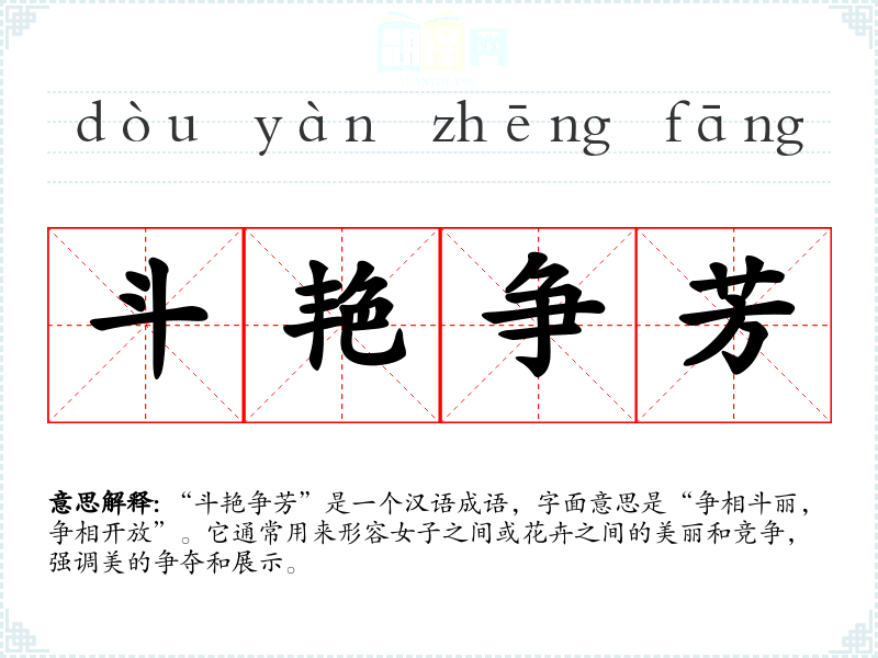 “斗艳争芳”是一个汉语成语,字面意思是“争相斗丽,争相开放”。它通常用来形容女子之间或花卉之间的美丽和竞争,强调美的争夺和展示。