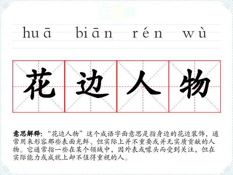 “花边人物”这个成语字面意思是指身边的花边装饰,通常用来形容那些表面光鲜、但实际上并不重要或并无实质贡献的人物。它通常指一些在某个领域中,因外表或噱头而受到关注,但在实际能力或成就上却不值得重视的人。
