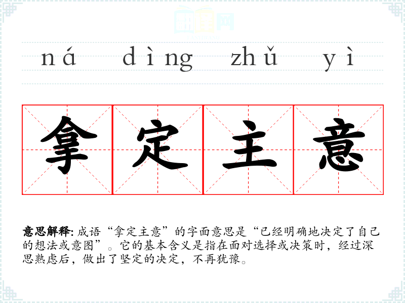 成语“拿定主意”的字面意思是“已经明确地决定了自己的想法或意图”。它的基本含义是指在面对选择或决策时,经过深思熟虑后,做出了坚定的决定,不再犹豫。