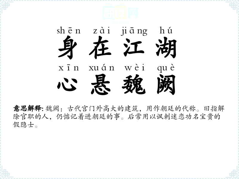 魏阙:古代天子及诸侯宫门外筑有高楼,其下两旁悬布法令,故代称朝廷。形容臣民忠君,关心国事。 |