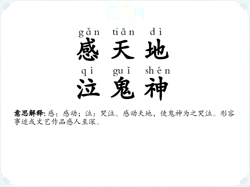动:感动;泣:低声哭。使天地鬼神受到感动。形容事迹或作品十分感人。 |
