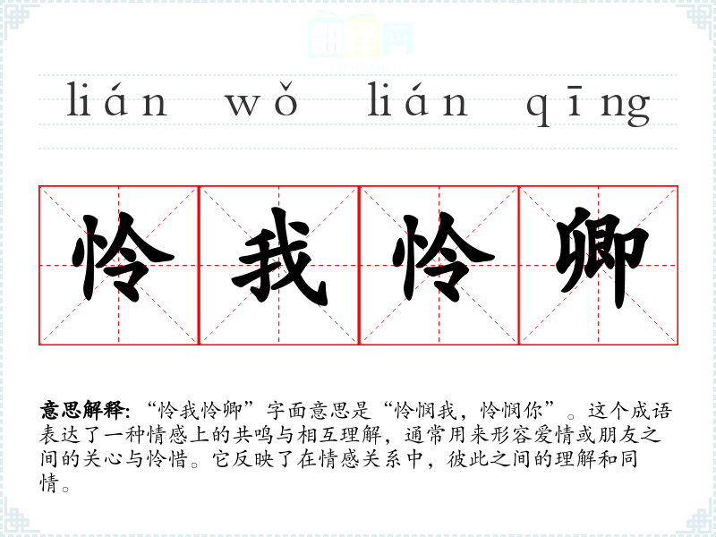 “怜我怜卿”字面意思是“怜悯我,怜悯你”。这个成语表达了一种情感上的共鸣与相互理解,通常用来形容爱情或朋友之间的关心与怜惜。它反映了在情感关系中,彼此之间的理解和同情。