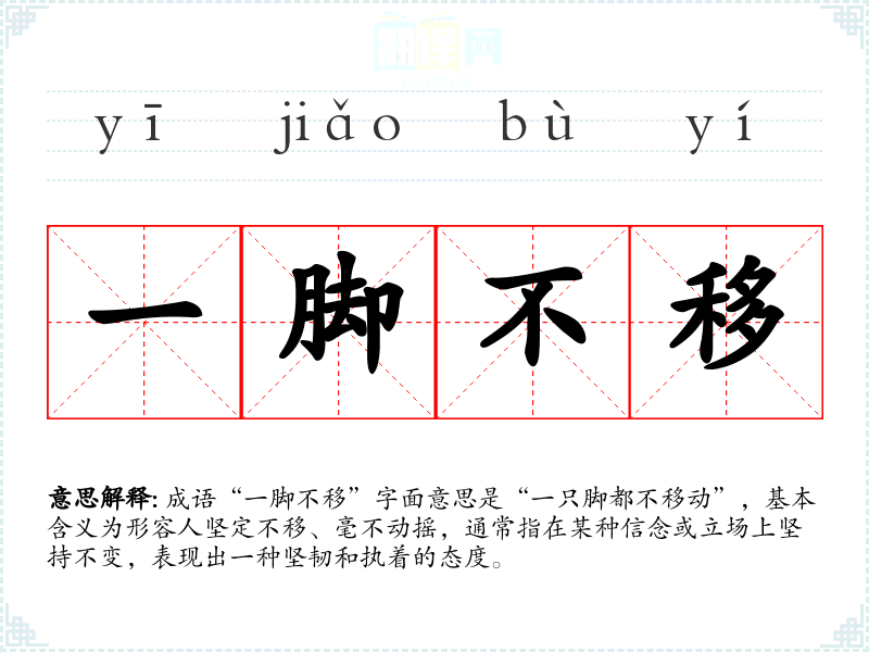 成语“一脚不移”字面意思是“一只脚都不移动”,基本含义为形容人坚定不移、毫不动摇,通常指在某种信念或立场上坚持不变,表现出一种坚韧和执着的态度。
