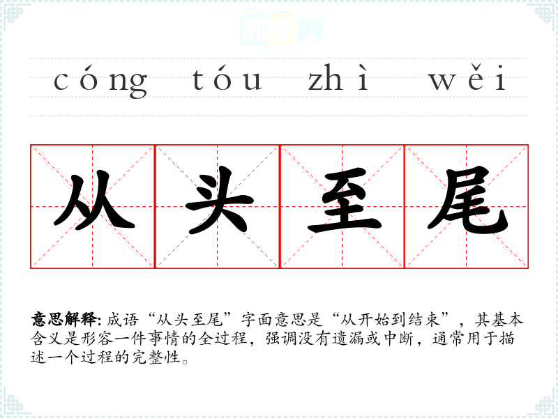 成语“从头至尾”字面意思是“从开始到结束”,其基本含义是形容一件事情的全过程,强调没有遗漏或中断,通常用于描述一个过程的完整性。