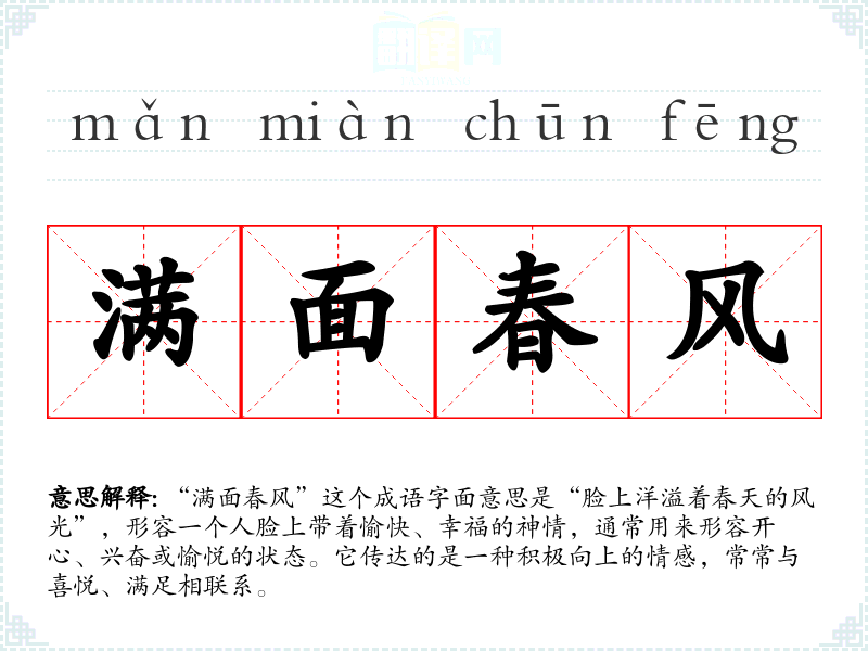 “满面春风”这个成语字面意思是“脸上洋溢着春天的风光”,形容一个人脸上带着愉快、幸福的神情,通常用来形容开心、兴奋或愉悦的状态。它传达的是一种积极向上的情感,常常与喜悦、满足相联系。