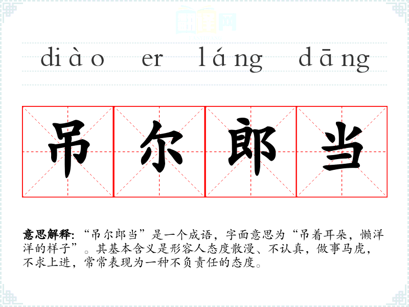“吊尔郎当”是一个成语,字面意思为“吊着耳朵,懒洋洋的样子”。其基本含义是形容人态度散漫、不认真,做事马虎,不求上进,常常表现为一种不负责任的态度。