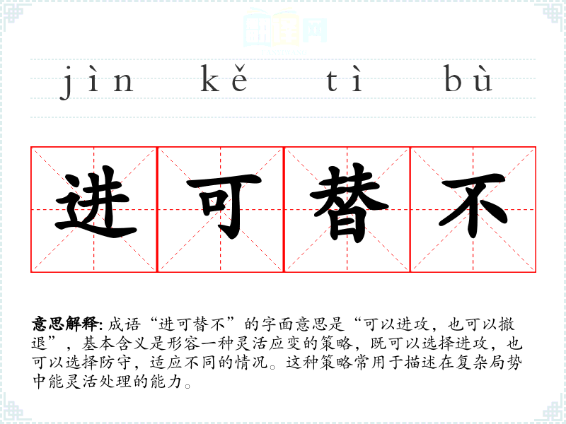 成语“进可替不”的字面意思是“可以进攻,也可以撤退”,基本含义是形容一种灵活应变的策略,既可以选择进攻,也可以选择防守,适应不同的情况。这种策略常用于描述在复杂局势中能灵活处理的能力。