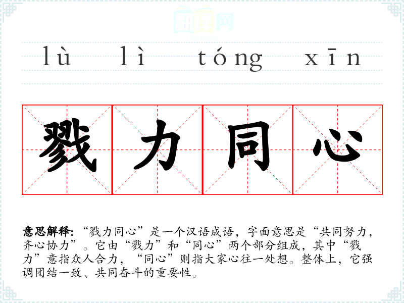 “戮力同心”是一个汉语成语,字面意思是“共同努力,齐心协力”。它由“戮力”和“同心”两个部分组成,其中“戮力”意指众人合力,“同心”则指大家心往一处想。整体上,它强调团结一致、共同奋斗的重要性。