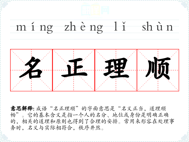 成语“名正理顺”的字面意思是“名义正当,道理顺畅”。它的基本含义是指一个人的名分、地位或身份是明确正确的,相关的道理和原则也得到了合理的安排。常用来形容在处理事务时,名义与实际相符合,秩序井然。