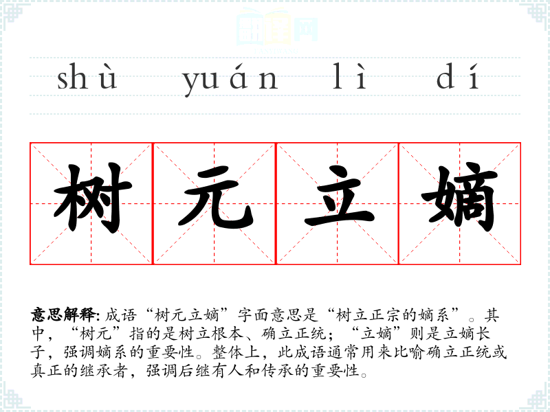 成语“树元立嫡”字面意思是“树立正宗的嫡系”。其中,“树元”指的是树立根本、确立正统;“立嫡”则是立嫡长子,强调嫡系的重要性。整体上,此成语通常用来比喻确立正统或真正的继承者,强调后继有人和传承的重要性。