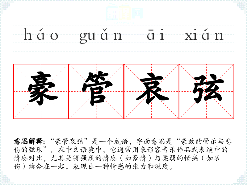 “豪管哀弦”是一个成语,字面意思是“豪放的管乐与悲伤的弦乐”。在中文语境中,它通常用来形容音乐作品或表演中的情感对比,尤其是将强烈的情感(如豪情)与柔弱的情感(如哀伤)结合在一起,表现出一种情感的张力和深度。