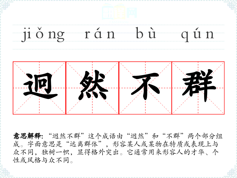 “迥然不群”这个成语由“迥然”和“不群”两个部分组成。字面意思是“远离群体”,形容某人或某物在特质或表现上与众不同,独树一帜,显得格外突出。它通常用来形容人的才华、个性或风格与众不同。