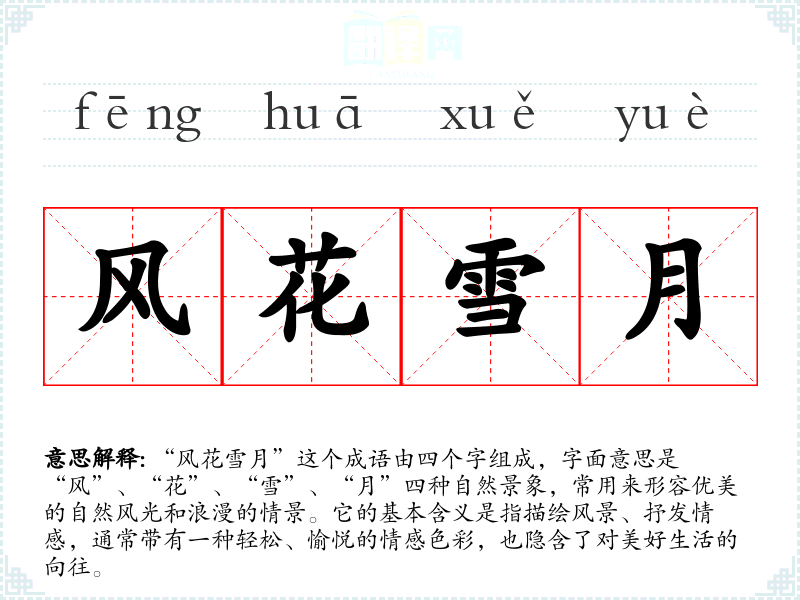 “风花雪月”这个成语由四个字组成,字面意思是“风”、“花”、“雪”、“月”四种自然景象,常用来形容优美的自然风光和浪漫的情景。它的基本含义是指描绘风景、抒发情感,通常带有一种轻松、愉悦的情感色彩,也隐含了对美好生活的向往。