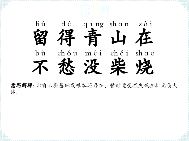 比喻能保留最根本的条件,其他问题就可得到解决。同“留得青山在,不怕没柴烧”。 |