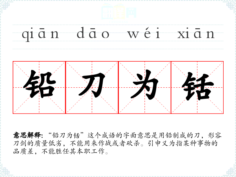 “铅刀为铦”这个成语的字面意思是用铅制成的刀,形容刀剑的质量低劣,不能用来作战或者砍杀。引申义为指某种事物的品质差,不能胜任其本职工作。