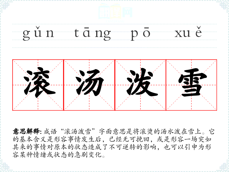 成语“滚汤泼雪”字面意思是将滚烫的汤水泼在雪上。它的基本含义是形容事情发生后,已经无可挽回,或是形容一场突如其来的事情对原本的状态造成了不可逆转的影响,也可以引申为形容某种情绪或状态的急剧变化。