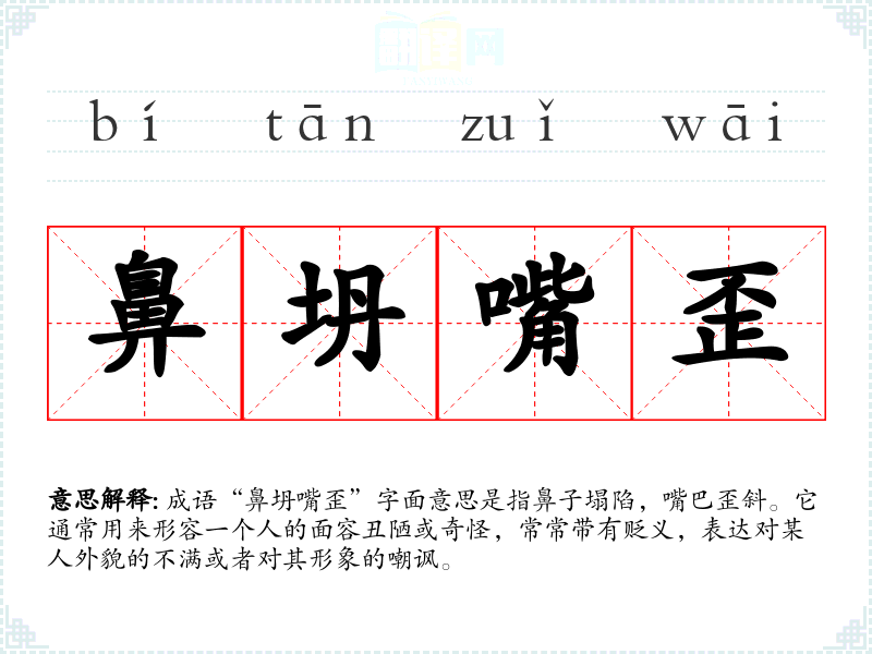 “鼻坍嘴歪”这个成语的具体历史背景和典故并不十分明确,但其形象化的描述很可能是源于古代文学作品中对人物形象的刻画。在古代,外貌常常被用来作为道德或性格的象征,因此,类似的成语在文学中经常出现。