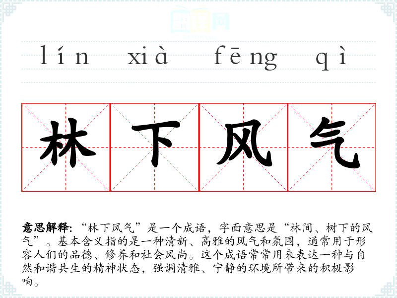“林下风气”一词的来源可以追溯到古代文人对自然环境的追求。在古典文献中,许多文人雅士常常聚集在林间、山水之间,借助自然的清幽之美来提升自身的品格和气质。这个成语的使用可以反映出古人对清净环境和高尚品德的向往。
