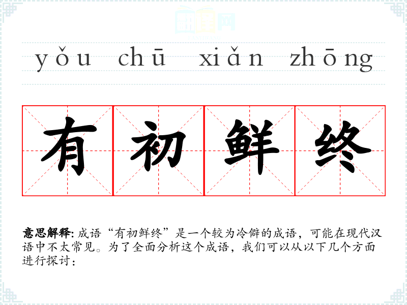 成语“有初鲜终”是一个较为冷僻的成语,可能在现代汉语中不太常见。为了全面分析这个成语,我们可以从以下几个方面进行探讨: