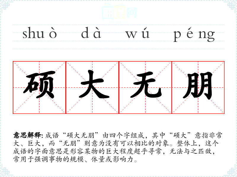 | 硕大无朋 | 硕:大;朋:比。大得没有可以与之相比的。形容极大。 |