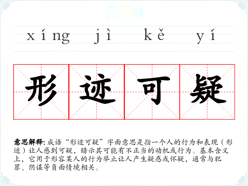 成语“形迹可疑”字面意思是指一个人的行为和表现(形迹)让人感到可疑,暗示其可能有不正当的动机或行为。基本含义上,它用于形容某人的行为举止让人产生疑惑或怀疑,通常与犯罪、阴谋等负面情境相关。